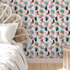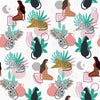 This desert inspired wallpaper feels right on trend in tones of pastel pink and mint green. Featuring desert cats, tropical greenery and silhouettes of sitting women, this wallpaper makes a great addition to a bedroom or bathroom.